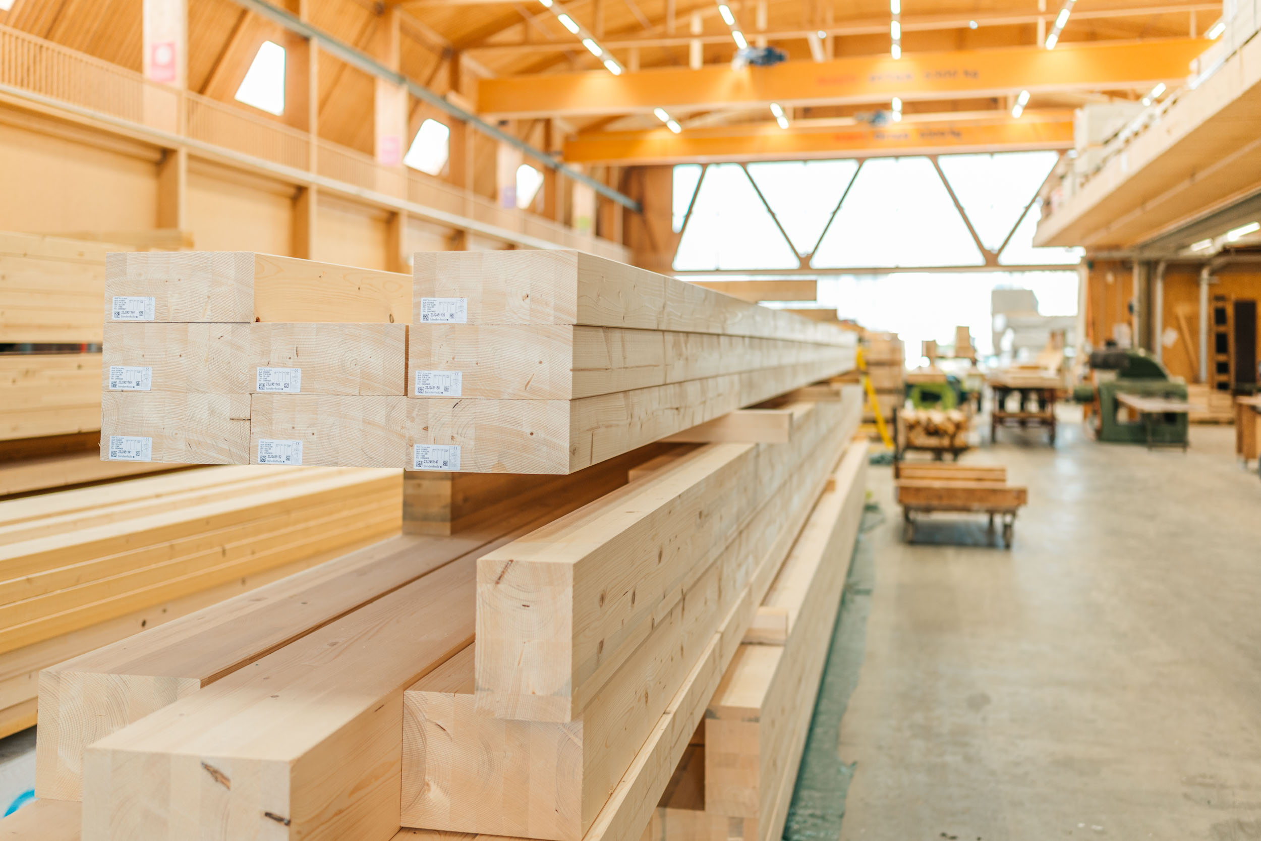 Heutzutage werden die Balken aus Konstruktionsholz und Brettschichtholz auf der CNC-gesteuerten Abbundmaschine mit präzisen Fräsungen versehen, dank derer sie sich zum Tragwerk verbinden lassen. Verschiedene kraftschlüssige Verbindungen von Holz zu Holz (Schwalbenschwanz etc.) sorgen dafür, dass einwirkende Trag-, Zug-, und Scherkräfte von dem einen auf das andere Bauteil übertragen werden und so äusserst leichte, tragfähige Tragwerkstrukturen gebaut werden können. Für Tragwerke, die grössere Distanzen überspannen, bietet der Holzbau auch Lösungen mit gebogenen Bindern.